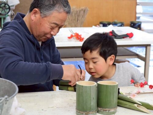 作成は、モノづくり担当のあべちゃんに進行してもらい、岩谷さんには各テーブルを回っていただき作り方のアドバイスを丁寧に教えてもらいました。あべちゃんは今年、篠笛製作に打ち込んでいたので、竹の扱いはお手の物😉