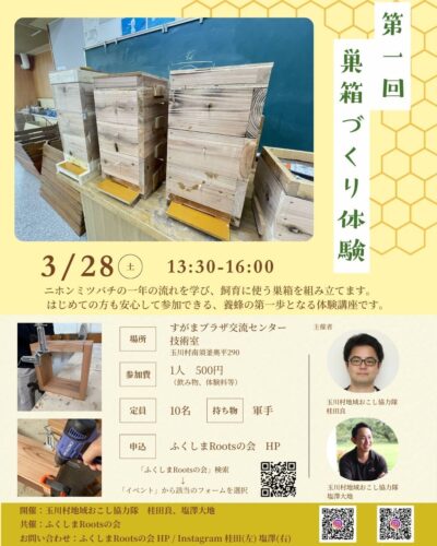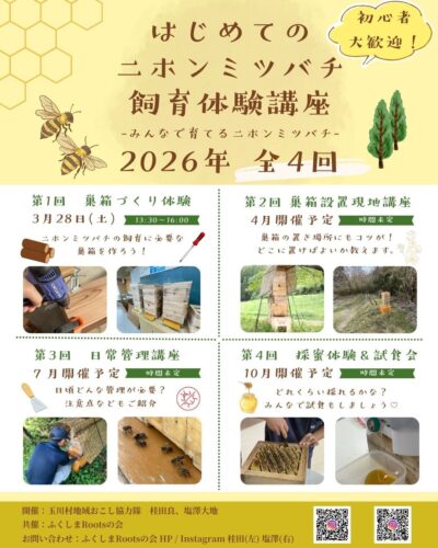 2026年を通して玉川村地域おこし協力隊でありRootsのメンバーの桂田さんと共催で「はじめてのニホンミツバチ飼育体験講座(全4回)」を開催します!